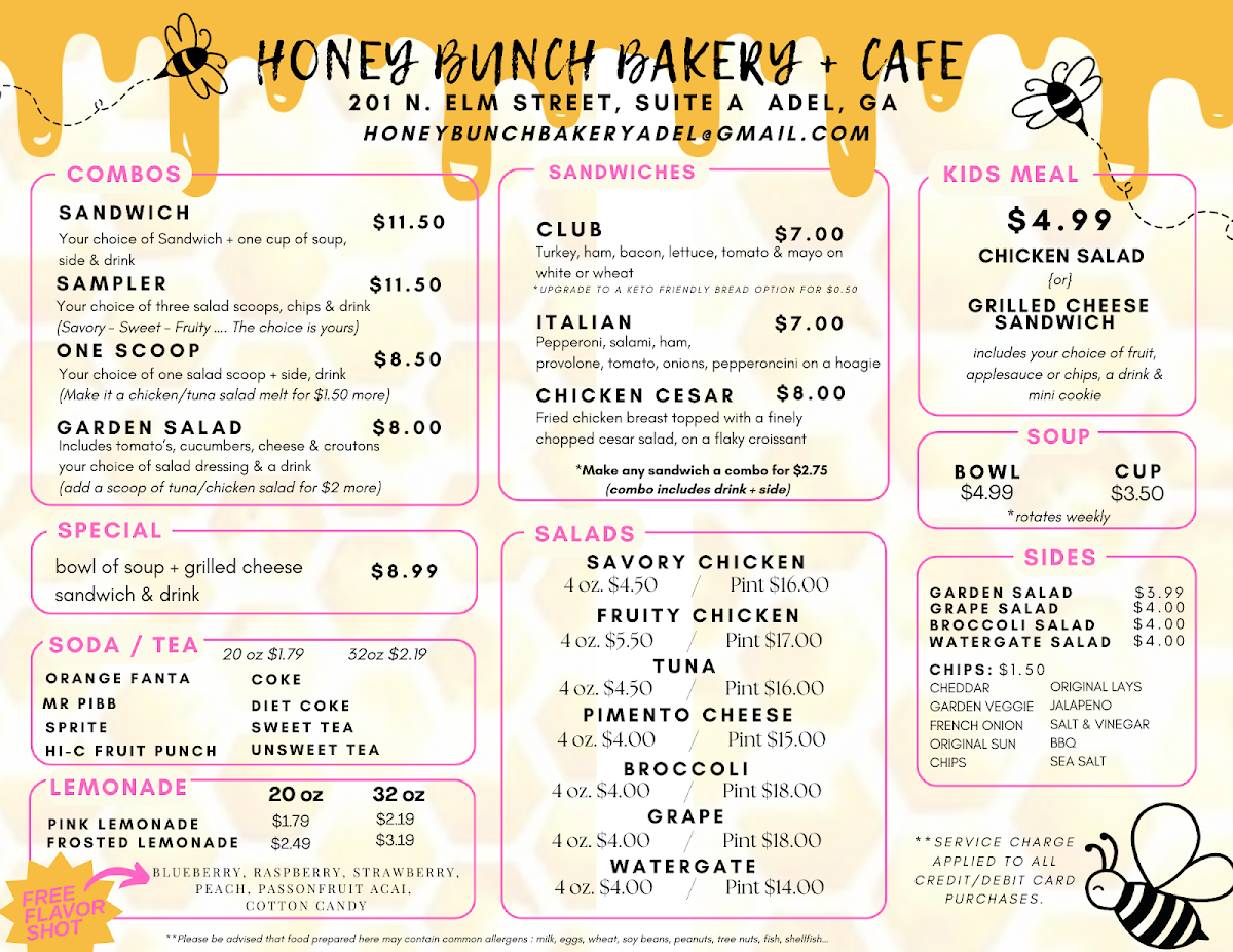 Stepping into Honey Bunch Bakery And Cafe Menu feels a bit like wandering into a cozy spot you’ve been meaning to try for ages. Tucked away at 201 N Elm St suite a in Adel, it offers the kind of dishes that make you slow down and enjoy the moment. You’ll find hearty breakfast plates right alongside lighter bites, so it’s easy to pick something that fits your mood. And while the fresh-baked pastries tend to steal a lot of attention, the café’s warm sandwiches and comfort-style sides keep things interesting. As you look through the options, everything feels familiar yet just special enough to spark curiosity. Whether you’re craving something sweet, something savory, or a bit of both, the menu makes choosing feel more like a treat than a task.